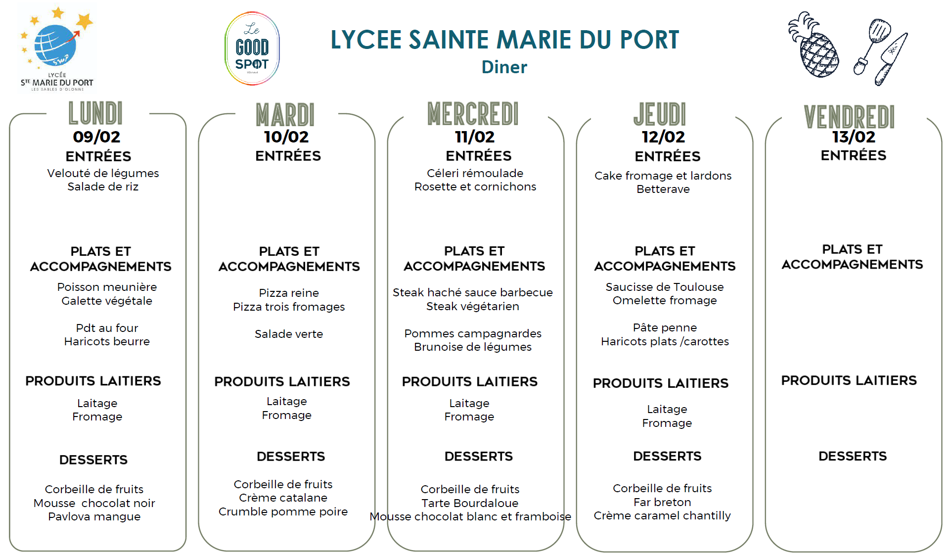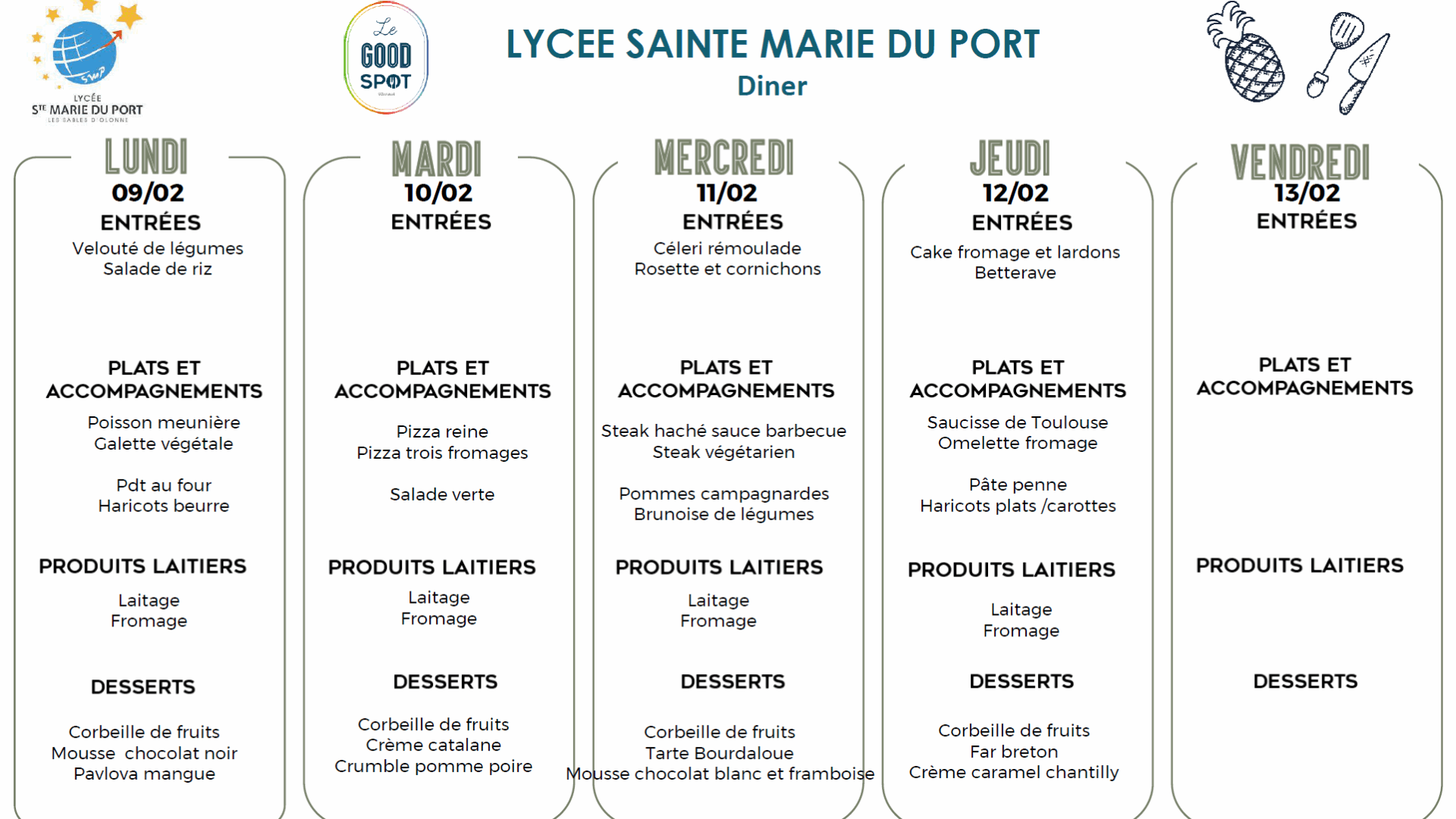 Menus diner du 09/02/2026 au 13/02/2026