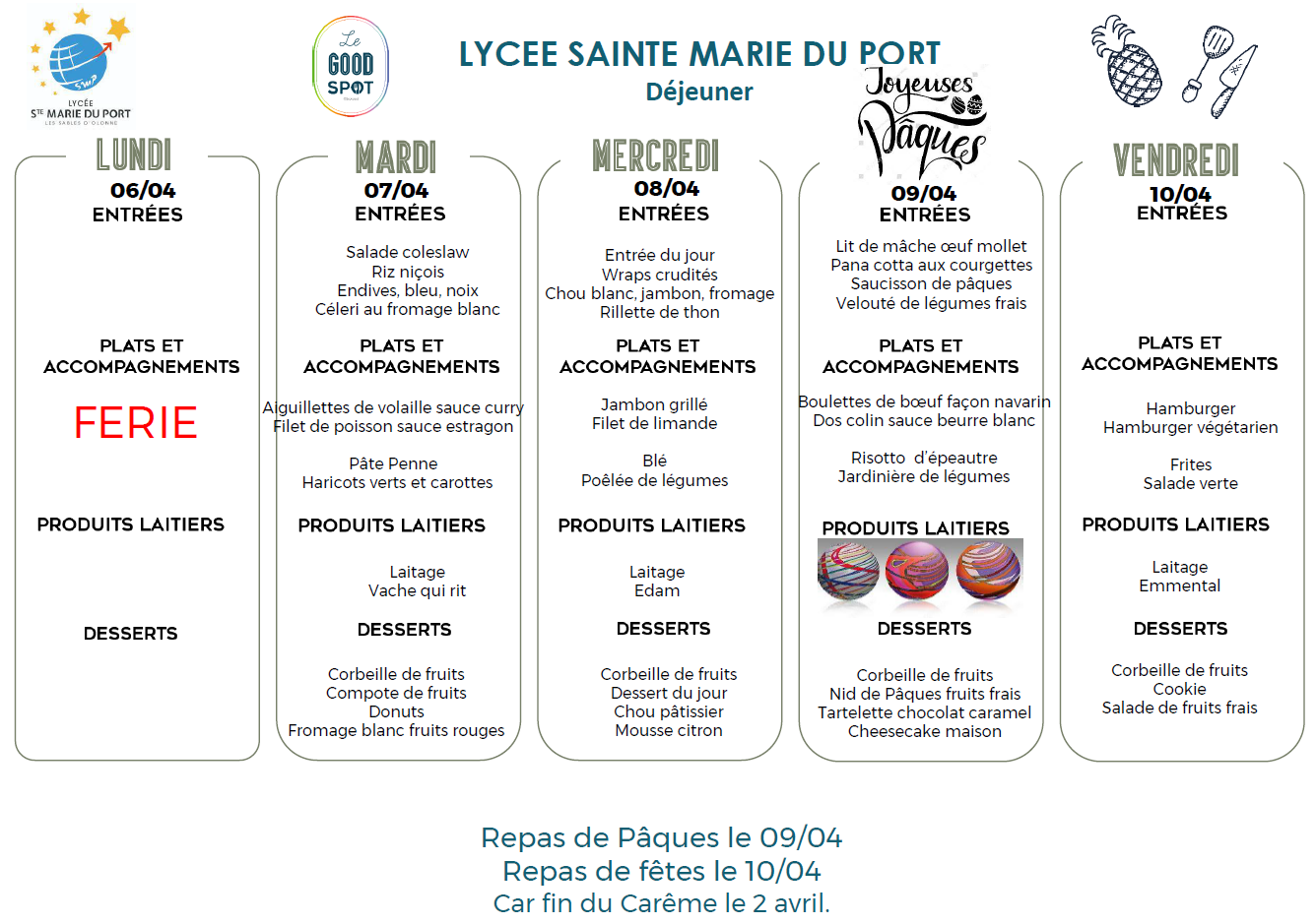 Menus déjeuner du 06/04/2026 au 10/04/2026