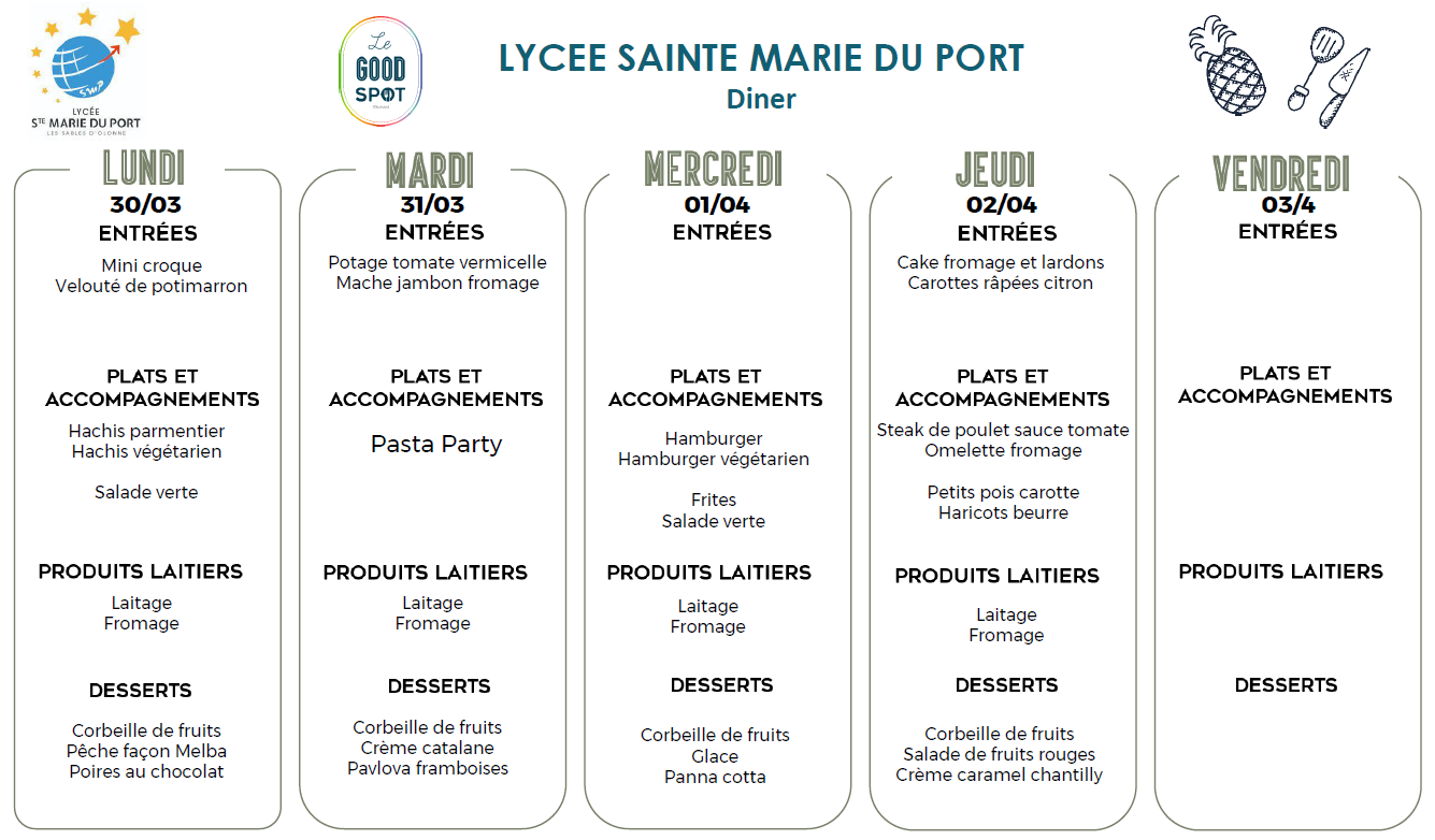 Menus diner du 30/03/2026 au 03/04/2026