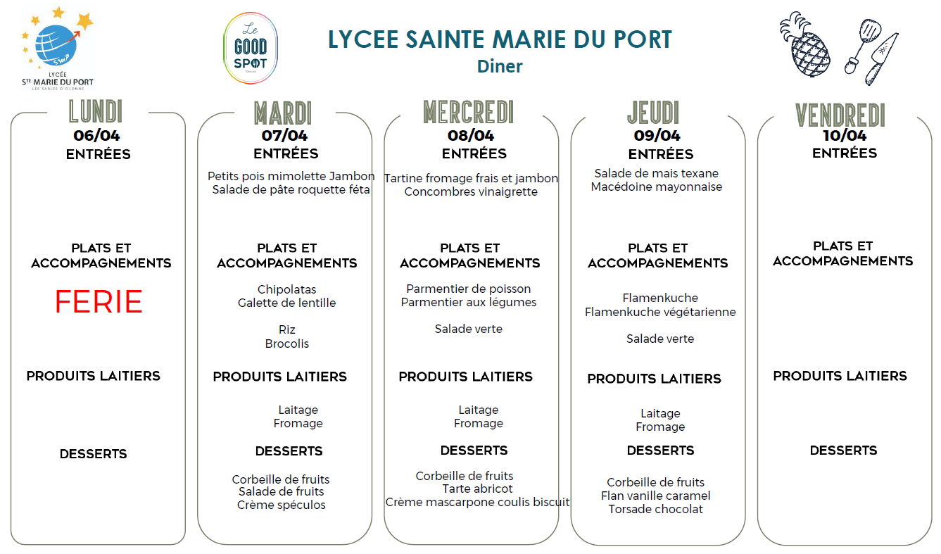 Menus diner du 06/04/2026 au 10/04/2026